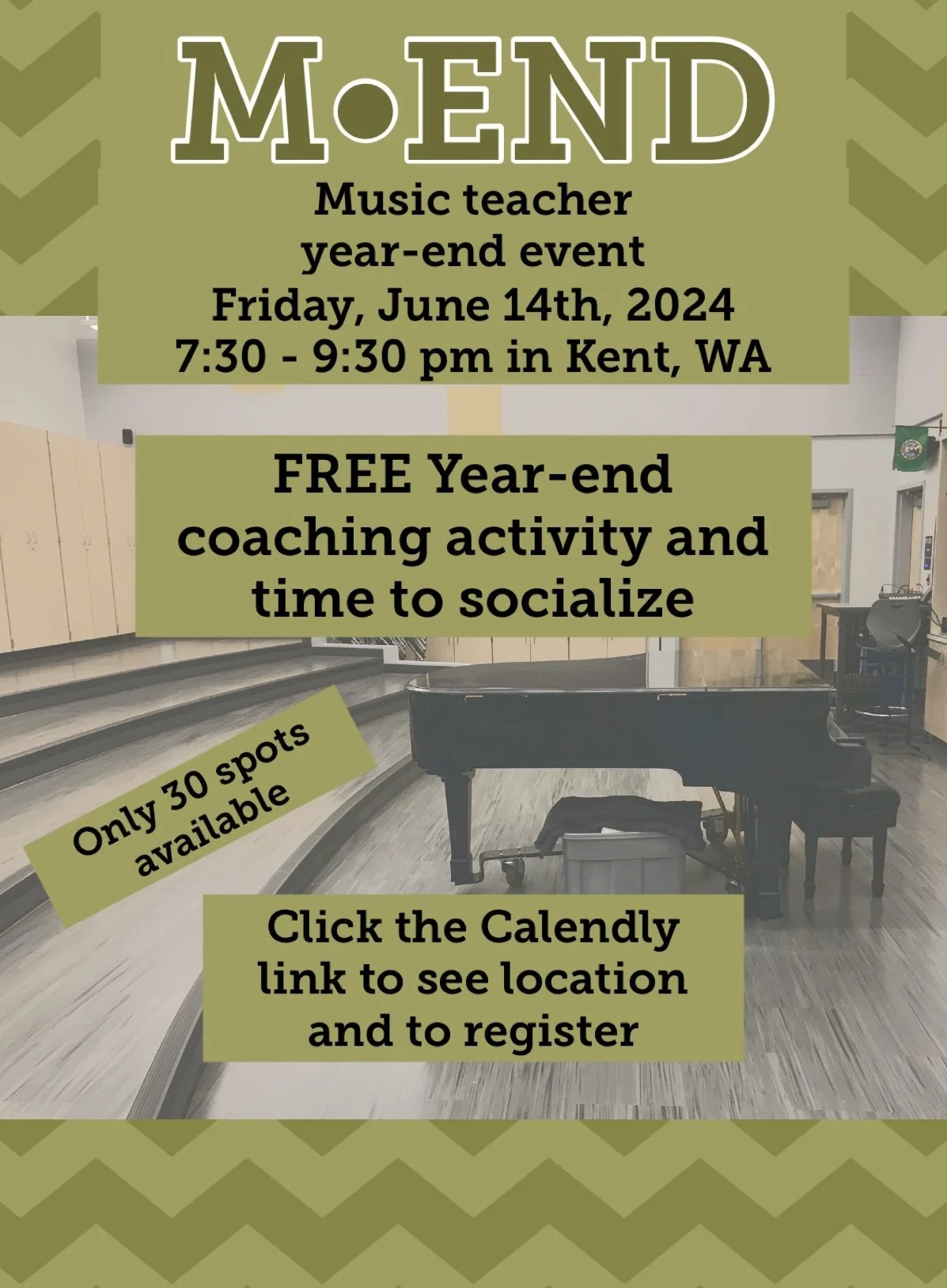 This is a FREE event, only being held on Friday, June 14th at 7:30 pm in Kent, WA. Come unwind at the end(ish) of the school year! Amy Pennington will lead you through a quick end-of-year thought process and then you'll have time socialize with other school music teachers. Food and beverages available for purchase.